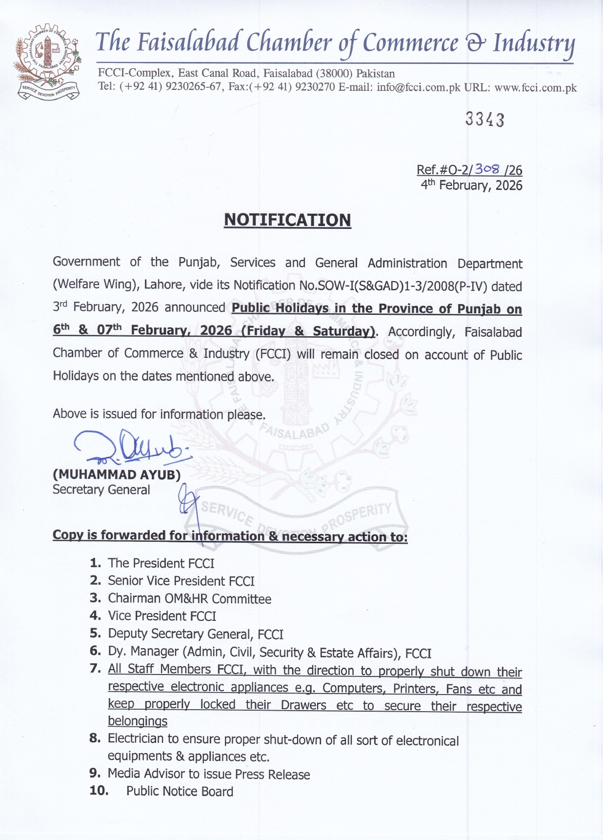 The Faisalabad Chamber of Commerce and industry is an apolitical, independent, membership based, volunteer driven, not-for-profit organization with a clear mandate to lead and serve the business community of this land of opportunities.