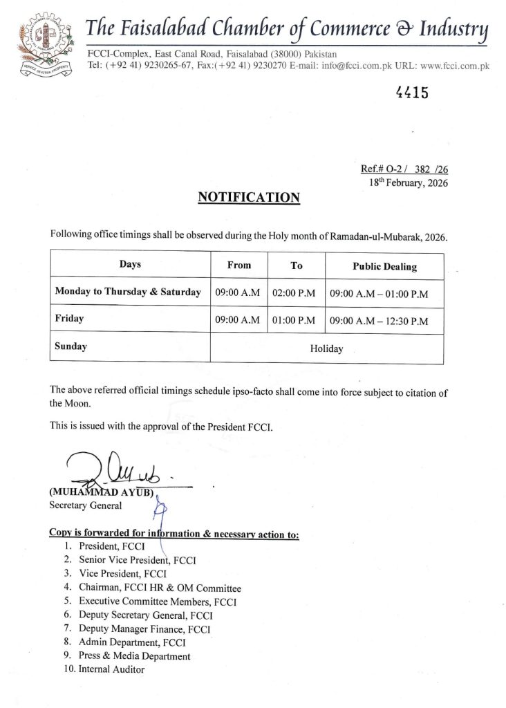 Following office timings shall be observed during the Holy month of Ramadan-ul-Mubarak, 2026.